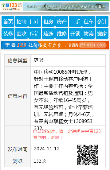 中国移动10085外呼助理,针对于现有移动客户回访工作;主要工作内容包括:全国最新活动营销及通知;男女不限,年龄16-45周岁,有无经验均可,企业带薪培训、无试用期;月休4-6天,有意者电联杨女士13089531332 【电话咨询时,请一定说明在七台河信息网看到的,谢谢!】 |
