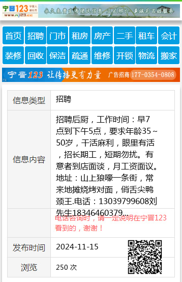 招聘后厨,工作时间:早7点到下午5点,要求年龄35~50岁,干活麻利,眼里有活,招长期工,短期勿扰。有意者到店面谈,月工资面议。地址:山上狼嚎一条街,常来地摊烧烤对面,俏舌尖鸭颈王.电话:13039799608刘先生18346460379 【电话咨询时,请一定说明在七台河信息网看到的,谢谢!】 |