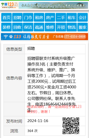 招聘银联支付系统升级推广操作员3名(主要负责支付系统升级、维护、推广、换码等工作),试用期一个月工资2000元,试用期过后工资2500元+奖金月工资4000左右。节假日,周日休息。公司缴纳社保。联系人李先生,电话18646442444李先生18646442444 【电话咨询时,请一定说明在七台河信息网看到的,谢谢!】 |