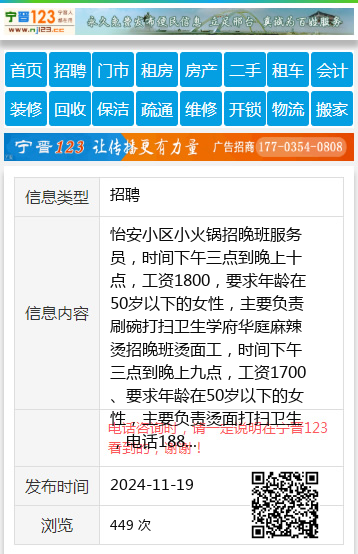 怡安小区小火锅招晚班服务员,时间下午三点到晚上十点,工资1800,要求年龄在50岁以下的女性,主要负责刷碗打扫卫生学府华庭麻辣烫招晚班烫面工,时间下午三点到晚上九点,工资1700、要求年龄在50岁以下的女性,主要负责烫面打扫卫生,电话18846466650彭18846466650 【电话咨询时,请一定说明在七台河信息网看到的,谢谢!】 |