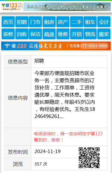 今麦郎方便面现招聘市区业务一名,主要负责超市的订货补货,工作简单,工资待遇优厚,周天有休息。要求能长期稳定,年龄45岁以内,有经验者优先。王先生18246496261 【电话咨询时,请一定说明在七台河信息网看到的,谢谢!】 |