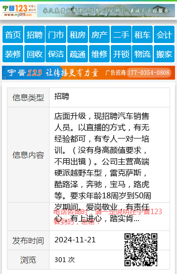 店面升级,现招聘汽车销售人员。以直播的方式,有无经验都可,有专人一对一培训。(没有身高颜值要求,不用出镜)。公司主营高端硬派越野车型,雷克萨斯,酷路泽,奔驰,宝马,路虎等。要求年龄18周岁到50周岁期间。爱岗敬业,有责任心,有上进心,踏实肯干。工资待遇:无责底薪+提成+带薪休假+中午食堂。工资在一万多到三万左右。欢迎有识之士前来致电。联系电话:15804652123逄先生高女士13945580730 【电话咨询时,请一定说明在七台河信息网看到的,谢谢!】 |