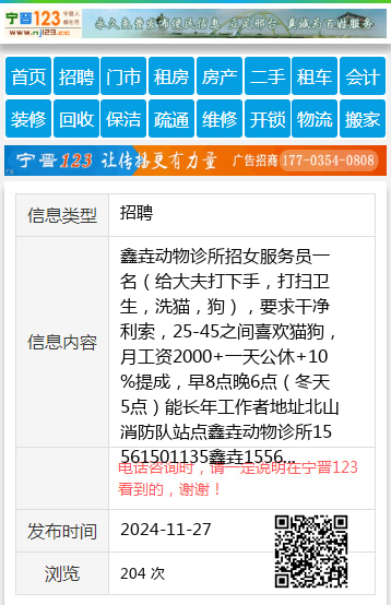 鑫垚动物诊所招女服务员一名(给大夫打下手,打扫卫生,洗猫,狗),要求干净利索,25-45之间喜欢猫狗,月工资2000+一天公休+10%提成,早8点晚6点(冬天5点)能长年工作者地址北山消防队站点鑫垚动物诊所15561501135鑫垚15561501135
