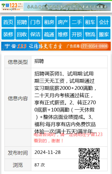 招聘调茶师1、试用期:试用期三天无工资,试用期通过实习期底薪2000+200满勤,二十天月内考核通过转正,享有正式薪资。2、转正2700底薪+100满勤(一天休假)+整体店面业绩提成。3、福利:每月享有店内免费饮品体验一次(满十五天)满半年工龄奖300满一年工龄奖600,男女不限,18-37岁,有无饮品经验均可。4、早晚班两班倒、早班:8:30-16:30晚班13:00-21:00一天八小时地址:桃山区大润发一楼林里手打柠檬茶1394652986619845131577赵18945476707 【电话咨询时,请一定说明在七台河信息网看到的,谢谢!】 |