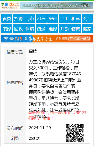 万宝招聘驿站理货员,每日只入300件,工作轻松,待遇优,联系电话微信18704649967招聘快递上门取件业务员,要求自带省油车辆,懂网购退换货,会使用智能手机,早八晚七,要求长期短期不用,心高气傲脾气暴躁者勿扰,计件或提成可议,详情15645570345邱经理18704649967 【电话咨询时,请一定说明在七台河信息网看到的,谢谢!】 |