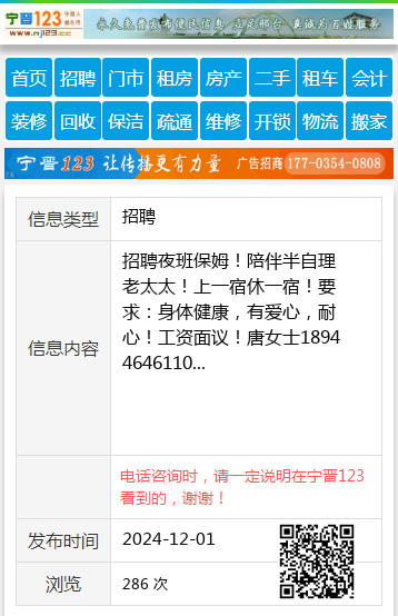 招聘夜班保姆!陪伴半自理老太太!上一宿休一宿!要求:身体健康,有爱心,耐心!工资面议!唐女士18944646110