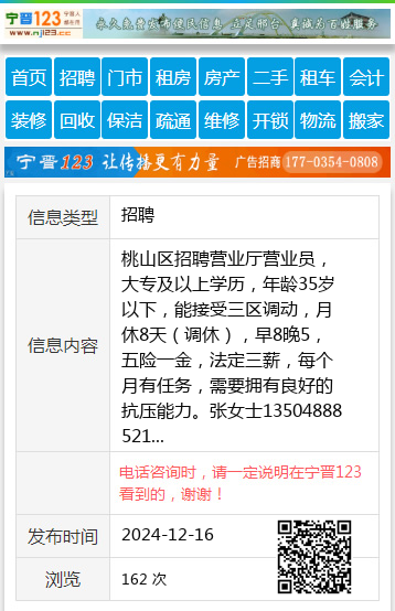 桃山区招聘营业厅营业员,大专及以上学历,年龄35岁以下,能接受三区调动,月休8天(调休),早8晚5,五险一金,法定三薪,每个月有任务,需要拥有良好的抗压能力。张女士13504888521 【电话咨询时,请一定说明在七台河信息网看到的,谢谢!】 |