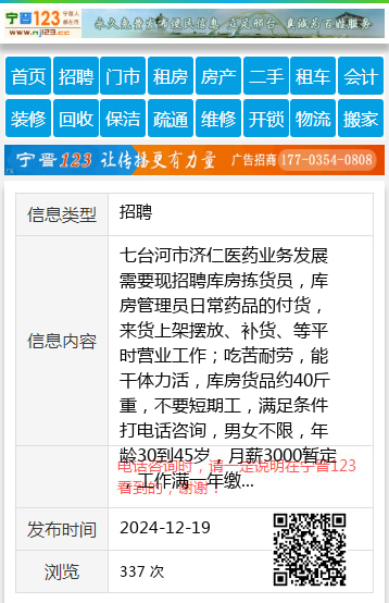 七台河市济仁医药业务发展需要现招聘库房拣货员,库房管理员日常药品的付货,来货上架摆放、补货、等平时营业工作;吃苦耐劳,能干体力活,库房货品约40斤重,不要短期工,满足条件打电话咨询,男女不限,年龄30到45岁,月薪3000暂定,工作满一年缴纳社会保险。工作时间早7.30晚5点。每周日下午休息。工作地点冠军桥路广顺街37号,电话15145669866联系人:高经理高经理15145669866 【电话咨询时,请一定说明在七台河信息网看到的,谢谢!】 |