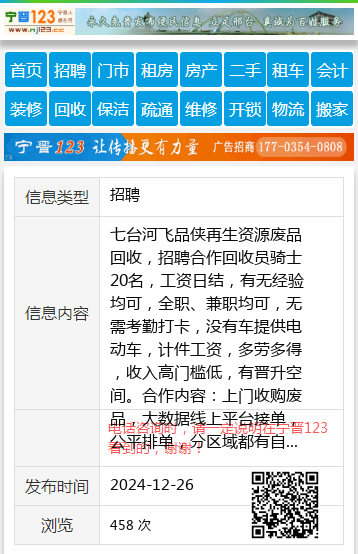 七台河飞品侠再生资源废品回收,招聘合作回收员骑士20名,工资日结,有无经验均可,全职、兼职均可,无需考勤打卡,没有车提供电动车,计件工资,多劳多得,收入高门槛低,有晋升空间。合作内容:上门收购废品,大数据线上平台接单,公平排单,分区域都有自己的片区,工作地点七台河市区内。月薪6000元—10000+元上不封顶。详情请拨打18646461131(微信同步)废品免费上门回收热线:0464-292833315214649666一斤废品也上门!称准!不缺斤少两!飞品侠18646461131 【电话咨询时,请一定说明在七台河信息网看到的,谢谢!】 |