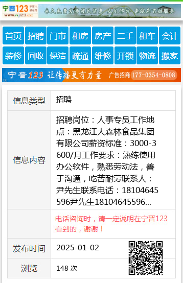 招聘岗位:人事专员工作地点:黑龙江大森林食品集团有限公司薪资标准:3000-3600/月工作要求:熟练使用办公软件,熟悉劳动法,善于沟通,吃苦耐劳联系人:尹先生联系电话:18104645596尹先生18104645596 【电话咨询时,请一定说明在七台河信息网看到的,谢谢!】 |