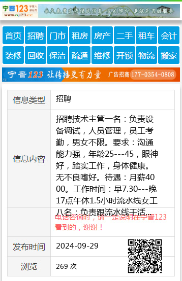 招聘技术主管一名:负责设备调试,人员管理,员工考勤,男女不限。要求:沟通能力强,年龄25---45,眼神好,踏实工作,身体健康。无不良嗜好。待遇:月薪4000。工作时间:早7.30---晚17点午休1.5小时流水线女工八名:负责跟流水线干活。要求:手脚麻利,眼神好,踏实肯干,年龄25--40岁工作时间:早7.30---晚17点,午休1.5小时。待遇:月薪3000。工作地点:茄子河富贵园以上岗位有无经验均可孙先生13846410520 【电话咨询时,请一定说明在七台河信息网看到的,谢谢!】 |