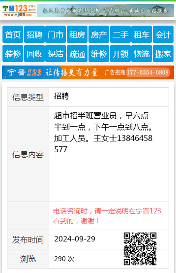 超市招半班营业员,早六点半到一点,下午一点到八点。加工人员。王女士13846458577