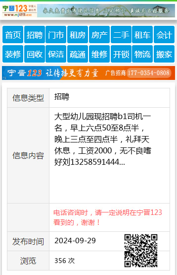 大型幼儿园现招聘b1司机一名,早上六点50至8点半,晚上三点至四点半,礼拜天休息,工资2000,无不良嗜好刘13258591444 【电话咨询时,请一定说明在七台河信息网看到的,谢谢!】 |