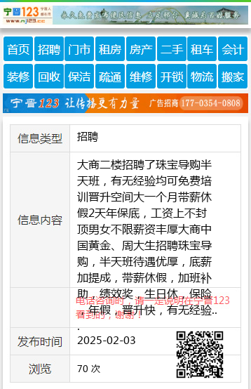 大商二楼招聘了珠宝导购半天班,有无经验均可免费培训晋升空间大一个月带薪休假2天年保底,工资上不封顶男女不限薪资丰厚大商中国黄金、周大生招聘珠宝导购,半天班待遇优厚,底薪加提成,带薪休假,加班补助,绩效奖,生日休,保险,年假,晋升快,有无经验均可,男女不限,勤奋有责任心,工作上不封顶,欢迎加入刘店长18145417779 【电话咨询时,请一定说明在七台河信息网看到的,谢谢!】 |