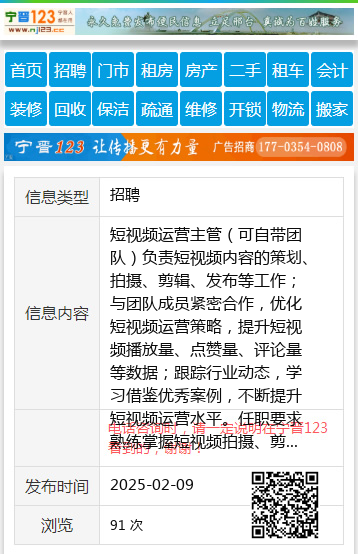 短视频运营主管(可自带团队)负责短视频内容的策划、拍摄、剪辑、发布等工作;与团队成员紧密合作,优化短视频运营策略,提升短视频播放量、点赞量、评论量等数据;跟踪行业动态,学习借鉴优秀案例,不断提升短视频运营水平。任职要求熟练掌握短视频拍摄、剪辑软件;具备良好的创意思维和文案功底;具有良好的团队协作精神和沟通能力,能承受工作压力;有短视频运营经验者优先。薪资待遇:底薪+绩效提成额外福利:月休四天,公司缴纳三险。工作时间:早8:00晚17:00(夏)16:30(冬)。联系电话:18714641100(微信同号)工作地址:七台河市桃山区桃东街奋斗路薪悦18714641100 |