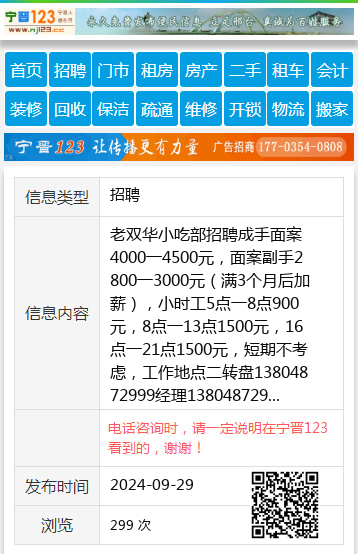 老双华小吃部招聘成手面案4000一4500元,面案副手2800一3000元(满3个月后加薪),小时工5点一8点900元,8点一13点1500元,16点一21点1500元,短期不考虑,工作地点二转盘13804872999经理13804872999 【电话咨询时,请一定说明在七台河信息网看到的,谢谢!】 |