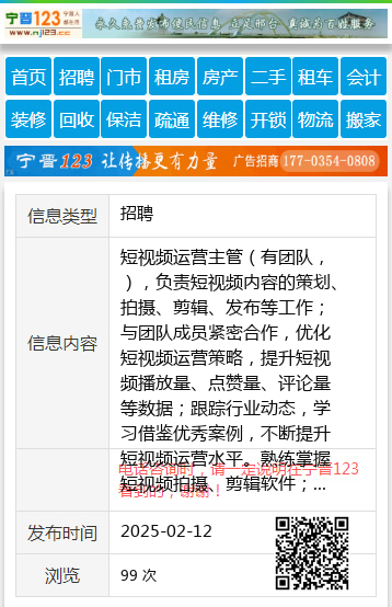 短视频运营主管(有团队,),负责短视频内容的策划、拍摄、剪辑、发布等工作;与团队成员紧密合作,优化短视频运营策略,提升短视频播放量、点赞量、评论量等数据;跟踪行业动态,学习借鉴优秀案例,不断提升短视频运营水平。熟练掌握短视频拍摄、剪辑软件;具备良好的创意思维和文案功底;具有良好的团队协作精神和沟通能力,能承受工作压力;有短视频运营经验者优先。房产经济人(无经验免费培训)不限学历、不限男女,具有良好的服务意识、服从管理、性格开朗、吃苦耐劳、能承受工作的压力;有团队意识、有合作精神、忠诚公司、忠诚团队薪资待遇:底薪+绩效提成(月收入轻松过万)额外福利:月休四天,公司缴纳三险。工作时间:早8:00晚17:00(夏)16:30(冬)。联系电话:18714641100(微信同号)工作地址:七台河市桃山区桃东街奋斗路六小东门对面薪悦房产薪悦18714641100 【电话咨询时,请一定说明在七台河信息网看到的,谢谢!】 |