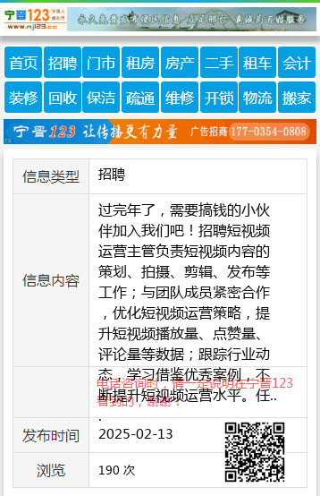 过完年了,需要搞钱的小伙伴加入我们吧!招聘短视频运营主管负责短视频内容的策划、拍摄、剪辑、发布等工作;与团队成员紧密合作,优化短视频运营策略,提升短视频播放量、点赞量、评论量等数据;跟踪行业动态,学习借鉴优秀案例,不断提升短视频运营水平。任职要求熟练掌握短视频拍摄、剪辑软件;具备良好的创意思维和文案功底;具有良好的团队协作精神和沟通能力,能承受工作压力;有短视频运营经验者优先。薪资待遇:底薪+绩效提成(月收入轻松过万)额外福利:月休四天,公司缴纳三险。工作时间:早8:00晚17:00(夏)16:30(冬)午休一个半小时。联系电话:18714641100(微信同号)工作地址:七台河市桃山区桃东街奋斗路(第六小学对面)薪悦18714641100 【电话咨询时,请一定说明在七台河信息网看到的,谢谢!】 |