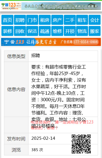 要求:有超市或零售行业工作经验,年龄25岁-45岁,女士,店内干净利索,没有水果蔬菜,好干活。工作时间中午12点-晚上10点,工资:3000元/月。固定时间不倒班。每月一天休息➕年节福利。工作内容:理货、卖货、收银。地址:七号公馆21号楼吴先生15145667151 【电话咨询时,请一定说明在七台河信息网看到的,谢谢!】 |