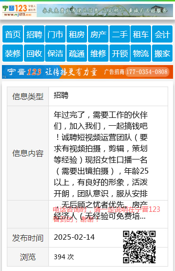 年过完了,需要工作的伙伴们,加入我们,一起搞钱吧!诚聘短视频运营团队(要求有视频拍摄,剪辑,策划等经验)现招女性口播一名(需要出镜拍摄),年龄25以上,有良好的形象,活泼开朗,团队意识,服从安排,无后顾之忧者优先。房产经济人(无经验可免费培训)具有良好的服务意识、服从管理、性格开朗、吃苦耐劳、能承受工作的压力,有团队意识、有合作精神;薪资待遇:底薪+绩效提成(无经验可免费培训)额外福利:月休四天,公司缴纳三险。工作时间:早8:00晚17:00(夏)16:30(冬)午休一个半小时。联系电话:18714641100(微信同号)工作地址:七台河市桃山区桃东街奋斗路六小东门对面薪悦房产薪悦18714641100 【电话咨询时,请一定说明在七台河信息网看到的,谢谢!】 |