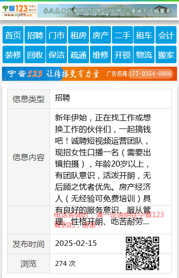 新年伊始,正在找工作或想换工作的伙伴们,一起搞钱吧!诚聘短视频运营团队,现招女性口播一名(需要出镜拍摄),年龄20岁以上,有团队意识,活泼开朗,无后顾之忧者优先。房产经济人(无经验可免费培训)具有良好的服务意识、服从管理、性格开朗、吃苦耐劳、能承受工作的压力,有团队意识、有合作精神;薪资待遇:底薪+绩效提成(无经验可免费培训)额外福利:月休四天,公司缴纳三险。工作时间:早8:00晚17:00(夏)16:30(冬)午休一个半小时。联系电话:18714641100(微信同号)工作地址:七台河市桃山区桃东街奋斗路六小东门对面薪悦房产薪悦18714641100 【电话咨询时,请一定说明在七台河信息网看到的,谢谢!】 |