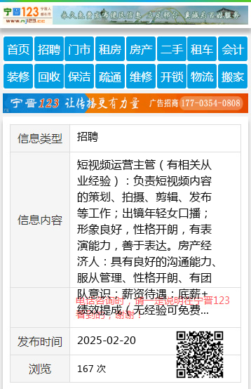 短视频运营主管(有相关从业经验):负责短视频内容的策划、拍摄、剪辑、发布等工作;出镜年轻女口播;形象良好,性格开朗,有表演能力,善于表达。房产经济人:具有良好的沟通能力、服从管理、性格开朗、有团队意识;薪资待遇:底薪+绩效提成(无经验可免费培训)额外福利:月休四天,公司缴纳三险。工作时间:上午8:00-11:30下午:13:00-17:00联系电话:18714641100(微信同号)工作地址:七台河市桃山区桃东街奋斗路六小东门对面薪悦房产薪悦18714641100 【电话咨询时,请一定说明在七台河信息网看到的,谢谢!】 |