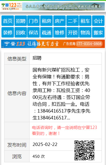 国有新兴煤矿招瓦检工,安全有保障!有通勤要求:男性,有井下工作经验者优先录用工种:瓦检员工资:4000元左右待遇:签订国企劳动合同,扣五险一金。电话:13846416517李先生李先生13846416517 【电话咨询时,请一定说明在七台河信息网看到的,谢谢!】 |