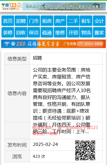公司的主要业务范围:房地产买卖、房屋租赁、房产信息咨询等业务。因公司发展需要现招聘房产经济人10名具有良好的沟通能力、服从管理、性格开朗、有团队意识;薪资待遇:底薪+绩效提成(无经验带薪培训)额外福利:月休四天,公司缴纳三险。工作时间:上午8:00-11:30下午:13:00-17:00联系电话:18714641100(微信同号)工作地址:七台河市桃山区桃东街奋斗路六小东门对面薪悦房产薪悦18714641100 【电话咨询时,请一定说明在七台河信息网看到的,谢谢!】 |
