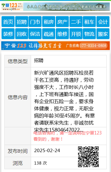 新兴矿通风区招聘瓦检员若干名工资高,待遇好,劳动强度不大,工作时长八小时,上下班有通勤车接送,国有企业扣五险一金,要求身体健康,视力正常,无职业病的年龄30至45周岁。有意者请联系宋先生,非诚勿扰宋先生15804647022