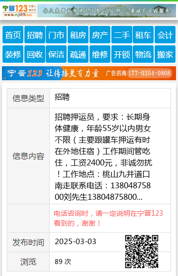 招聘押运员,要求:长期身体健康,年龄55岁以内男女不限(主要跟罐车押运有时在外地住宿)工作期间管吃住,工资2400元,非诚勿扰!工作地点:桃山九井道口南走联系电话:13804875800刘先生13804875800 【电话咨询时,请一定说明在七台河信息网看到的,谢谢!】 |