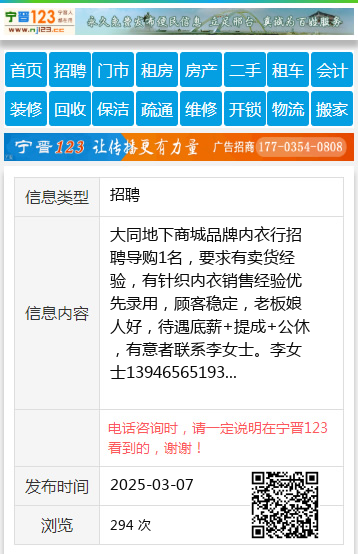 大同地下商城品牌内衣行招聘导购1名,要求有卖货经验,有针织内衣销售经验优先录用,顾客稳定,老板娘人好,待遇底薪+提成+公休,有意者联系李女士。李女士13946565193 【电话咨询时,请一定说明在七台河信息网看到的,谢谢!】 |