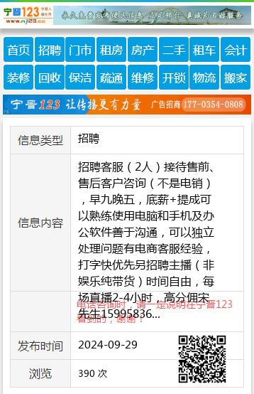 招聘客服(2人)接待售前、售后客户咨询(不是电销),早九晚五,底薪+提成可以熟练使用电脑和手机及办公软件善于沟通,可以独立处理问题有电商客服经验,打字快优先另招聘主播(非娱乐纯带货)时间自由,每场直播2-4小时,高分佣宋先生15995836878 【电话咨询时,请一定说明在七台河信息网看到的,谢谢!】 |