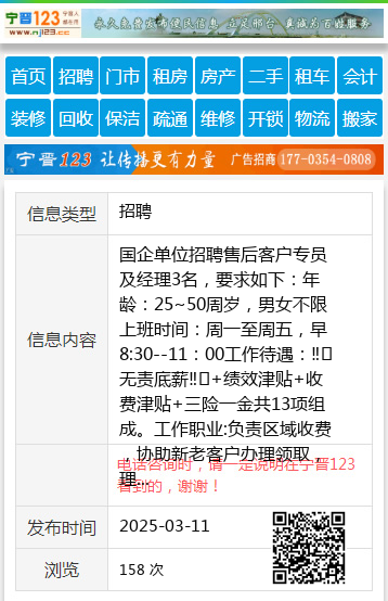国企单位招聘售后客户专员及经理3名,要求如下:年龄:25~50周岁,男女不限上班时间:周一至周五,早8:30--11:00工作待遇:‼️无责底薪‼️+绩效津贴+收费津贴+三险一金共13项组成。工作职业:负责区域收费,协助新老客户办理领取,理赔等服务项目,维护老客户,开拓新客户等等。招聘热线13945587907张经理13945587907 【电话咨询时,请一定说明在七台河信息网看到的,谢谢!】 |