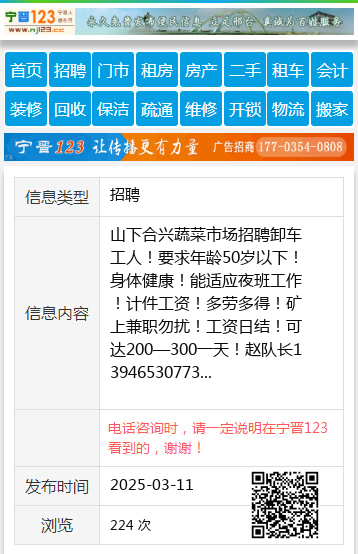 山下合兴蔬菜市场招聘卸车工人!要求年龄50岁以下!身体健康!能适应夜班工作!计件工资!多劳多得!矿上兼职勿扰!工资日结!可达200—300一天!赵队长13946530773 【电话咨询时,请一定说明在七台河信息网看到的,谢谢!】 |