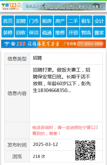 招聘打更。做饭夫妻工,招聘保安常白班。长期干活不放假,年龄60岁以下,彭先生18304668350