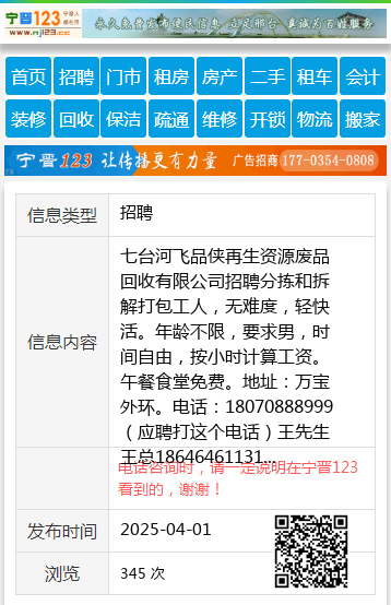 七台河飞品侠再生资源废品回收有限公司招聘分拣和拆解打包工人,无难度,轻快活。年龄不限,要求男,时间自由,按小时计算工资。午餐食堂免费。地址:万宝外环。电话:18070888999(应聘打这个电话)王先生王总18646461131 【电话咨询时,请一定说明在七台河信息网看到的,谢谢!】 |
