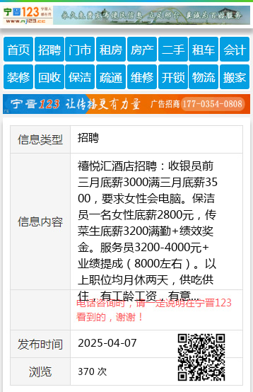 禧悦汇酒店招聘:收银员前三月底薪3000满三月底薪3500,要求女性会电脑。保洁员一名女性底薪2800元,传菜生底薪3200满勤+绩效奖金。服务员3200-4000元+业绩提成(8000左右)。以上职位均月休两天,供吃供住,有工龄工资,有意者联系13904670611女士13904670611 【电话咨询时,请一定说明在七台河信息网看到的,谢谢!】 |