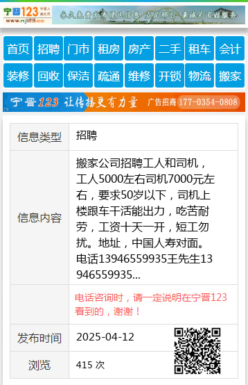 搬家公司招聘工人和司机,工人5000左右司机7000元左右,要求50岁以下,司机上楼跟车干活能出力,吃苦耐劳,工资十天一开,短工勿扰。地址,中国人寿对面。电话13946559935王先生13946559935 【电话咨询时,请一定说明在七台河信息网看到的,谢谢!】 |