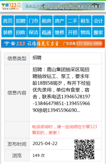 招聘:鹿山集团抽采区现招聘抽放钻工、泵工,要求年龄18到58周岁,有井下经验优先录用,单位有食堂,宿舍,联系电话13946528197-13846479851-13945596690徐明13945596690 【电话咨询时,请一定说明在七台河信息网看到的,谢谢!】 |