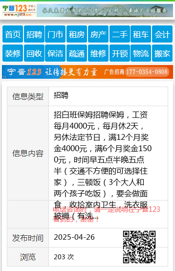 招白班保姆招聘保姆,工资每月4000元,每月休2天,另休法定节日,满12个月奖金4000元,满6个月奖金1500元,时间早五点半晚五点半(交通不方便的可选择住家),三顿饭(3个大人和两个孩子吃饭),要会做面食,收拾室内卫生,洗衣服被褥(有洗衣机),要求年龄在50周岁以下,有健康证,生活习惯干净利落,有意者打18545715454详谈先生18545715454 |