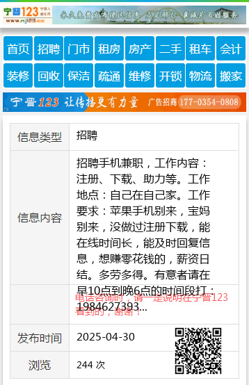 招聘手机兼职,工作内容:注册、下载、助力等。工作地点:自己在自己家。工作要求:苹果手机别来,宝妈别来,没做过注册下载,能在线时间长,能及时回复信息,想赚零花钱的,薪资日结。多劳多得。有意者请在早10点到晚6点的时间段打:19846273931(看清楚要求再打电话,非诚勿扰)J晴19846273931 【电话咨询时,请一定说明在七台河信息网看到的,谢谢!】 |