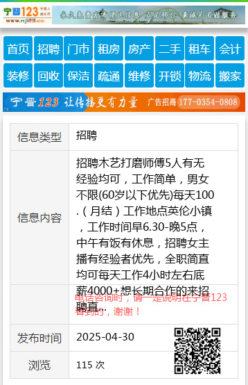 招聘木艺打磨师傅5人有无经验均可,工作简单,男女不限(60岁以下优先)每天100.(月结)工作地点英伦小镇,工作时间早6.30-晚5点,中午有饭有休息,招聘女主播有经验者优先,全职简直均可每天工作4小时左右底薪4000+想长期合作的来招聘直播助理4人,女生,年龄不限,中午11.00-15.00,夜场10.20-2.00以上时间段自己选,每天工作4小时左右,工作时间短灵活,工资2500+.想学习锻炼的老铁抓紧时间。招聘直播厂助2人,年龄不限,男生优先,体质要好,每天工作4小时左右,以下时间段自己选,中午11.00-15.00晚18.00-22.00.工作时间短灵活,工资2500+.想学习锻炼的老铁抓紧时间。工作地址:英伦小镇(万宝驾校里走)电话:19104645511张19104645511 |