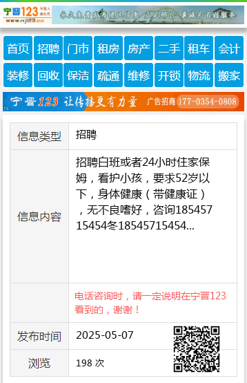 招聘白班或者24小时住家保姆,看护小孩,要求52岁以下,身体健康(带健康证),无不良嗜好,咨询18545715454冬18545715454 【电话咨询时,请一定说明在七台河信息网看到的,谢谢!】 |