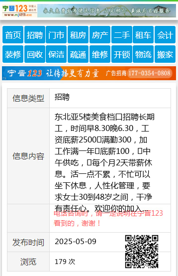 东北亚5楼美食档口招聘长期工,时间早8.30晚6.30,工资底薪2500➕满勤300,加工作满一年➕底薪100,➕中午供吃,➕每个月2天带薪休息。活一点不累,不忙可以坐下休息,人性化管理,要求女士30到48岁之间,干净有责任心。欢迎你的加入。王女士13329327773 【电话咨询时,请一定说明在七台河信息网看到的,谢谢!】 |