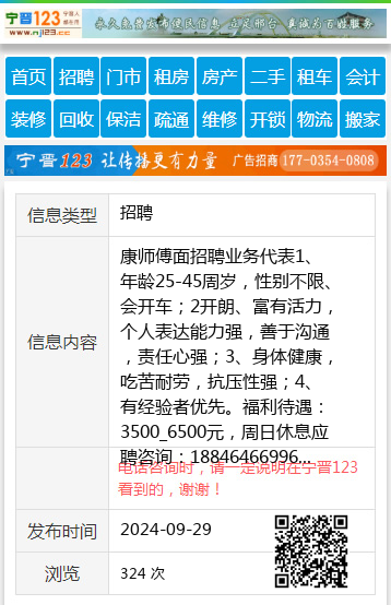 康师傅面招聘业务代表1、年龄25-45周岁,性别不限、会开车;2开朗、富有活力,个人表达能力强,善于沟通,责任心强;3、身体健康,吃苦耐劳,抗压性强;4、有经验者优先。福利待遇:3500_6500元,周日休息应聘咨询:18846466996滕先生18846466996 【电话咨询时,请一定说明在七台河信息网看到的,谢谢!】 |