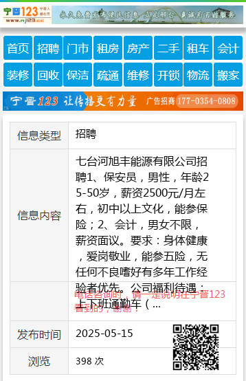 七台河旭丰能源有限公司招聘1、保安员,男性,年龄25-50岁,薪资2500元/月左右,初中以上文化,能参保险;2、会计,男女不限,薪资面议。要求:身体健康,爱岗敬业,能参五险,无任何不良嗜好有多年工作经验者优先。公司福利待遇:上下班通勤车(马场、茄子河、运销处);浴池;缴纳五险。地址:七台河市新兴区北山道口→北山大桥→桥头左转直走1500米(原凯博达公司院内)联系电话:0464-8392011(咨询请打此座机)曲女士13284642008 【电话咨询时,请一定说明在七台河信息网看到的,谢谢!】 |