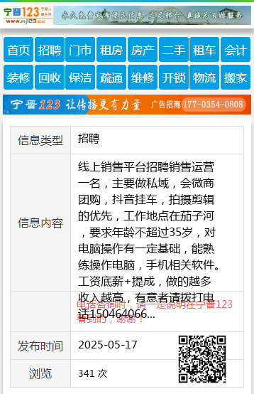 线上销售平台招聘销售运营一名,主要做私域,会微商团购,抖音挂车,拍摄剪辑的优先,工作地点在茄子河,要求年龄不超过35岁,对电脑操作有一定基础,能熟练操作电脑,手机相关软件。工资底薪+提成,做的越多收入越高,有意者请拨打电话15046406678张经理15046406678