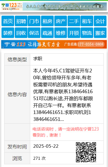 本人今年45,C1驾驶证开车20年,曾给领导开车多年,有老板需要司机的朋友,希望待遇优厚,有意者联系13846461651可以跑长途,开谁的车都跟开自己车一样。有意者联系13846461651.求职司机刘13846461651 【电话咨询时,请一定说明在七台河信息网看到的,谢谢!】 |