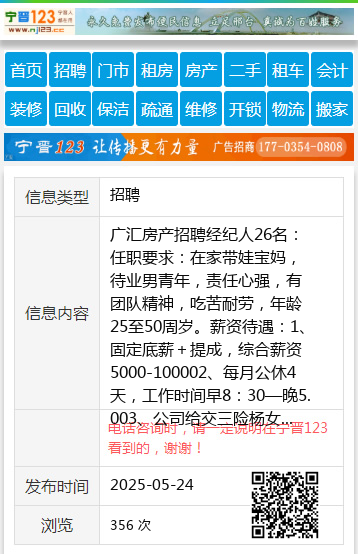 广汇房产招聘经纪人26名:任职要求:在家带娃宝妈,待业男青年,责任心强,有团队精神,吃苦耐劳,年龄25至50周岁。薪资待遇:1、固定底薪+提成,综合薪资5000-100002、每月公休4天,工作时间早8:30—晚5.003、公司给交三险杨女士13846497613