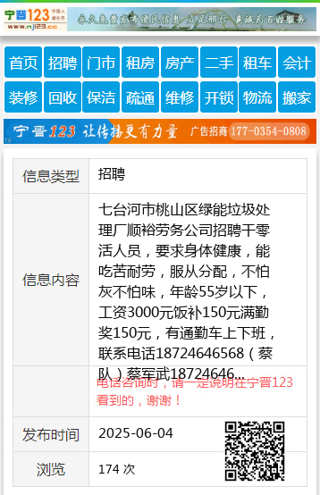 七台河市桃山区绿能垃圾处理厂顺裕劳务公司招聘干零活人员,要求身体健康,能吃苦耐劳,服从分配,不怕灰不怕味,年龄55岁以下,工资3000元饭补150元满勤奖150元,有通勤车上下班,联系电话18724646568(蔡队)蔡军武18724646568 【电话咨询时,请一定说明在七台河信息网看到的,谢谢!】 |